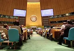 UNIS-UN was founded in 1976 by several UNIS students in collaboration with a Tutorial House (UNIS equivalent of high school) humanities teacher. The conference was first held on March 3 and 4, 1977, in the General Assembly Hall of the United Nations Headquarters, and became a tradition every year since then.[3] In 2011, the Cultural Showcase was introduced, featuring international performances at UNIS by visiting schools the day before the conference.[4] Due to the COVID-19 pandemic, the 2020 conference was cancelled along with the tradition of hosting visiting schools. The organizing committee has grown over the years (to its current number of approximately seventy).
