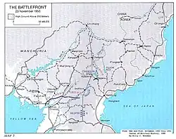 The Iron Triangle was an area of relatively flat terrain, shaped like an equilateral triangle, in the mountains of east central North Korea. It is situated 30–50 km (20–30 mi) above the 38th Parallel, halfway across the peninsula, and 80 km (50 mi) northeast of Seoul. It is bounded at its three corners by the towns of Ch'orwon at its western base, Kumhwa-eup at its eastern base, and P'yonggang at its northern apex. The area was an important North Korean rail and road communication center, linking east and west coastal areas with each other, and in turn connecting them with the communication net leading south through central South Korea. On 11 October the ROK 8th Division and the 7th Regiment of the 6th Division converged on P'yonggang. On 13 October the 7th Division arrived there by way of Kumhwa. All the ROK divisions, except the 1st, which was part of the US I Corps and accordingly under direct US command, were across the 38th Parallel before any of the American divisions crossed.[42]