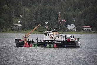 After commissioning, Elderberry was assigned to Petersburg, where she has been ever since. Her primary mission is to maintain 250 aids to navigation in Southeast Alaska, including those in Wrangell Narrows, Zimovia Strait,[9] and Gastineau Channel.[10] Elderberry faces a number of special challenges in this work. In tight passages such as Wrangell Narrows, small excursions by towed barges and log rafts destroy buoys and other aids to navigation.[11] In Rocky Pass, a shallow strait between Kuiu and Kupreanof Islands, Elderberry has had to work with only two feet of water under her keel.[12] Some buoys, such as those on the Mendenhall Bar in Gastineau Channel are seasonal. They are removed in the fall, so they are not damaged by ice, and then replaced in spring.[13]