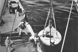In April 1948 Evergreen was the first buoy tender assigned to the International Ice Patrol. In this mission she would sail into the North Atlantic during the spring thaw. While off the coasts of Newfoundland, Labrador, and Greenland, she would assess conditions that could carry dangerous icebergs into shipping lanes.[16] This was the first off a decades-long series of ice patrol cruises. While on these patrols crewmen and visiting scientists sampled water temperatures using Nansen bottles,[17] and currents using a geomagnetic electrokinetograph.[18] She deployed a deep-sea buoy to collect oceanographic data.[19] Between 1948 and 1986 Evergreen was on ice patrol at least thirty-four times.[20][1]