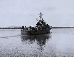 At the request of the United States Navy, in October 1965, she was alerted for service in South Vietnam and assigned to Coast Guard Squadron One in support of Operation Market Time along with 8 other Point class cutters.[14][15] While the crew completed overseas training and weapons qualifications at Coast Guard Island and Camp Parks, California, Point White was loaded onto a merchant ship, the Pioneer Myth and transported to Subic Bay, Philippines arriving in January 1966 where she was refitted for combat service.[7] Shipyard modifications included installation of new single-sideband radio equipment, additional floodlights, small arms lockers, bunks, additional sound-powered phone circuits, and the addition of 4 M2 machine guns. The original Oerlikon 20 mm cannon was replaced with a combination over-under .50 caliber machine gun/81mm trigger fired mortar that had been developed by the Coast Guard for service in Vietnam.[6][7][16][17] For service in Vietnam, two officers were added to the crew complement to add seniority to the crew in the mission of interdicting vessels at sea.[18]