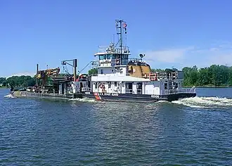Built by Gibbs Gas Engine Co. in Jacksonville, Florida and launched in 1962, the vessel has a length of 65 feet (20 m), a beam of 21 feet (6.4 m), and a shallow 5-foot (1.5 m) draft.[3] It is powered by two diesel engines, generating roughly 600 horsepower (450 kW) for a top speed of roughly 10 knots (19 km/h; 12 mph).[4] The ship has a nearly 3,100-nautical-mile (5,700 km; 3,600 mi) operational range. It is crewed by 12 to 19 crew members, depending on mission type.[4] The ships shallow draft allows it to operate in multiple types of river conditions, including shallow areas that would otherwise be unreachable. The vessel pushes a 90-foot (27 m) ATON barge, which houses all necessary equipment and tools, including a crane, needed for maintaining navigation buoys.[5] Its hull is strengthened to maintain safety in icy conditions.