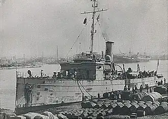 On 10 October 1945 the U.S. Navy decommissioned Unalga and turned her over to the War Shipping Administration. On 19 July 1946 she was sold and renamed Ulua. She participated in the immigration of Jewish refugees to British Mandatory Palestine. On 24 January 1947 Haganah renamed her Haim Arlosoroff after the assassinated leader of the Jewish Agency. The ship embarked on a voyage that carried 1,378 Jewish refugees in Sweden and Italy bound for British Mandatory Palestine. It was intercepted by the Royal Navy destroyer HMS Chieftain and ran aground at Bat Galim, Haifa on 27 February 1947. The crew and passengers, some of whom were injured, were arrested and deported to Cyprus.[20]