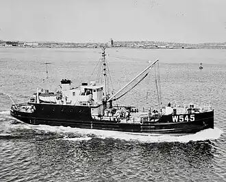The Navy's specifications for YF-445 and her sisterships included removable mine-laying tracks, allowing the vessel to carry up to 64 Mark VI mines.[4] While it appears that YF-445 was never used in this capacity, her class was sometimes referred to as "mine-layers."[8]