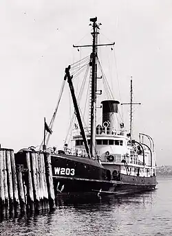 While some lightships of this era were capable of self-propulsion, many were towed to and from their stations. For example, in 1934 Arbutus towed to port for maintenance Relief Light Vessel No. 49 from its station in Buzzard's Bay.[20] In December 1935 Arbutus towed Boston Light Vessel No. 54 to drydock in Quincy after she was hit and almost sunk by the freighter Seven Seas Spray.[21]
