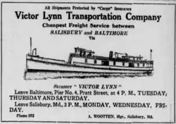 In March 1924 the motor vessel Victor Lynn burned at Whitehaven on the Wicomico River.[95] She had been the only vessel of the Victor Lynn Transportation Company, which had a regular freight line between Baltimore and Salisbury. In 1924 Queenstown was sold to the company's owner, Alphonso ("Al") Wootten, to replace the lost vessel and her name was changed to Victor Lynn.[15] The ownership of the ship was transferred from Wootten to the Victor Lynn Transportation Company in October 1925.[96]