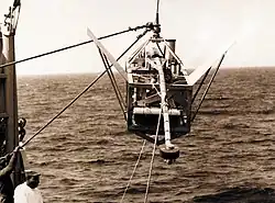 NRL's previous vessel with a center well, USS Hunting, provided experience and some problems to avoid in the Mizar design. The two major problems with that installation were wave action in the well that damaged the bulkheads until reinforced and air pressure caused by wave action in the well that forced the deck doors off their tracks.[5] The location of the 34 ft (10.4 m) number two hatch straddling the ship's center section made a center well through even the double bottom feasible. A well 23 ft (7.0 m) long and 10 ft (3.0 m) wide with curved fore and aft ends to reduce wave pounding within was installed. The keel level opening was reduced to one of 21 ft (6.4 m) long and 8 ft (2.4 m) wide. A flush mounted, water tight hydraulic door of two parts, one fore and one aft, closed the well at the main deck level. Three 24 in (61.0 cm) diameter cable sheaves installed in a carriage, within which towed devices would be contained for lowering and raising, and extending below the keel allowed towing of heavy equipment without exposure on open decks. The system had a capacity of 12 tons. Large "breather" ducts from the well relieved air pressure caused by wave action within when the doors were closed. All was enclosed by a housing allowing all weather protection for operators.[5][6][7] Mizar went into the Philadelphia Naval Shipyard in late 1965 with the installation of the well being a priority.[8]
