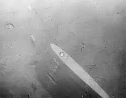Overhead view of Thresher's upper rudder photographed from Mizar's deep towed vehicle.