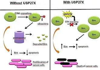 In some cancers, Bim is downregulated thanks to ERK-signaling.[17] Phosphorylation and ubiquitination of Bim dependent on ERK caused Bim to be degraded in proteasomes. However, presence of USP27X reduced ERK deubiquitination of BIM, causing Bim to stabilize and therefore increasing its apoptotic effects. This process has been proved in melanoma and non-small cell lung cancer (nsclc) cells.