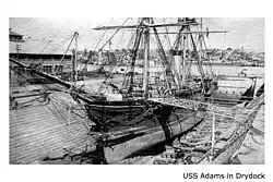 Turned over to Pennsylvania on 20 August 1908, Adams served as school ship for the Pennsylvania Nautical School in Philadelphia until returned to Navy custody on 6 February 1914.[1] On 1 May 1914, she was loaned to the State of New Jersey to be used in training that state's naval militia. The warship continued to train New Jersey naval militiamen until after the United States entered World War I in April 1917. Recommissioned on 27 August 1917, Adams served as station ship in the Delaware River through the end of the war until decommissioned on 5 August 1919.