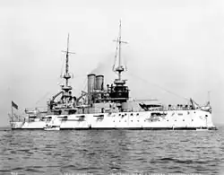 Alabama was laid down at the William Cramp & Sons shipyard in Philadelphia on 2 December 1896 and was launched on 18 May 1898. She was commissioned on 16 October 1900, the first member of her class to enter service.[2] The ship's first commander was Captain Willard H. Brownson. Alabama was assigned to the North Atlantic Squadron, though she remained at Philadelphia until 13 December, when she made a visit to New York, where she remained through January 1901. On the 27th, Alabama steamed south for the Gulf of Mexico, where she joined the rest of the North Atlantic Squadron for training exercises off Pensacola, Florida.[3] In August 1901, while the North Atlantic Squadron conducted target practice off of Nantucket Island, Alabama experienced an outbreak of mumps and was placed in quarantine, unable to participate.[4]