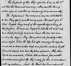On 20 May, Victor Randolph, the former commander of Albany and now commanding officer (pro tem) of the Naval Yard Warrington, reported that an appropriate mast had been identified and was ready for Albany. During the replacement of the main mast, there was also some discussion of the condition of the fore mast. Apparently both were replaced.[9]