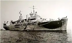 USS Albemarle (AV-5) was one of only two Curtiss-class seaplane tenders built for the United States Navy just prior to the United States' entry into World War II. Named for Albemarle Sound on the North Carolina coast, she was the third U.S. Naval vessel to bear the name. Albemarle was laid down on 12 June 1939 at Camden, New Jersey, by the New York Shipbuilding Corporation, and launched on 13 July 1940, sponsored by Mrs. Beatrice C. Compton, the wife of the Honorable Lewis Compton, Assistant Secretary of the Navy. She was commissioned at the Philadelphia Navy Yard on 20 December 1940, with Commander Henry M. Mullinnix in command. She was transferred to the Maritime Administration (MARAD) James River Fleet at Fort Eustis, Virginia. Placed in the custodial care of MARAD, Albemarle was struck from the Naval Vessel Register on 1 September 1962.