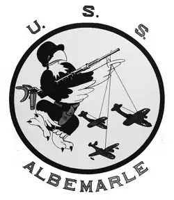 Underway for Guantánamo Bay on the last day of 1944, Albemarle dropped anchor there on 4 January 1945. Reporting to Commander, Fleet Air Wing 11, for temporary duty, she tended Patrol Bombing Squadrons (VPB) 201 and 210 at "Gitmo" until 17 January, when the seaplane tender sailed for Coco Solo, arriving at her destination on the 19th. Thence she sailed for Trinidad where she tended VPB-213 from 1–11 February. Shifting back to the Canal Zone soon thereafter, Albemarle commenced tending operations for VPB-214 at Almirante Bay, Panama, on 18 February, and remained engaged in that duty until 22 February. On 25 February, the ship was designated as flagship for Commander, Air Force, Atlantic Fleet, the day after she cleared Limon Bay for the Galápagos group. There, Albemarle tended VPB-74 and VPB-209 from 27 February – 6 March, when the seaplane tender got underway to return to the Canal Zone. She steamed thence to Guantánamo Bay and Norfolk, arriving at the latter place on 17 March for an availability that lasted through mid-May 1945. Albemarle cleared Norfolk on 18 May for New York, laden with cargo, escorted by the destroyers Bernadou and Dallas. Two days later, the seaplane tender sailed for the British Isles in CU-71, a convoy formed around the venerable USAT George Washington. Albemarle's mission was to bring back to the United States those patrol squadrons whose task in the Atlantic had been completed with the end of the War in Europe, and whose presence was required in the still-active Pacific theater. Ultimately, Albemarle reached her destination, Avonmouth, on 30 May, and brought her passengers – men of Fleet Air Wing 7 – back to Norfolk on 14 June. Albemarle made a second voyage to Avonmouth, sailing from Hampton Roads on 4 July 1945 and reaching her destination on 13 July. There she embarked 772 sailors and soldiers, the majority of the latter repatriated prisoners of war. Underway on the 17th, the seaplane tender arrived back at Norfolk on the 26th.[4]