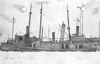 ![]() USS Ardent (SP-680) in an icy port in southern New England sometime between 1917 and 1919. Behind her is the patrol vessel and minesweeper USS Eugene F. Price (SP-839).