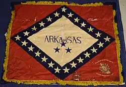The Arkansas was the catalyst for the creation of the Flag of Arkansas. In 1912 the Daughters of the American Revolution (DAR) decided that they would present three flags to the battleship as she was nearing her commission date. The three flags the DAR chose to present were the American Flag, Navy battalion Ensign, and a state flag. When the DAR learned from the Arkansas Secretary of State, Earle W. Hodges, that Arkansas possessed no official state flag, they decided to hold a statewide competition to come up with one. The winning design was from Willie Kavanaugh Hocker of Pine Bluff, Arkansas, who was also a member of the DAR.[30] On 26 February 1913, with a few alterations, Hocker's design become the official flag of Arkansas and was soon thereafter presented to the USS Arkansas by the DAR.[31]