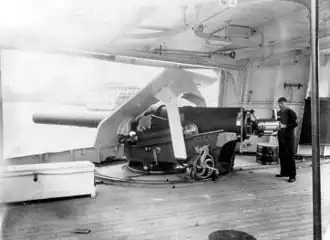 As-built armament included two 8-inch (203 mm)/30 caliber Mark 1 guns,[3] six 6-inch (152 mm)/30 caliber Mark 2 guns,[4] two 6-pounder (57 mm (2.24 in)) rapid fire guns, two 3-pounder (47 mm (1.85 in)) Hotchkiss revolving cannon, two 1-pounder (37 mm (1.46 in)) Hotchkiss revolving cannon, and two .45 caliber (11.4 mm) Gatling guns.[2] The 8-inch guns were initially in open barbettes with gun shields added later.[5]