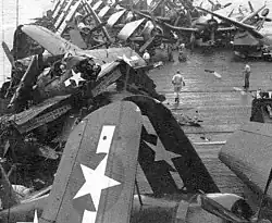![]() USS Attu after weathering Typhoon Connie. Several aircraft are in disarray on deck.