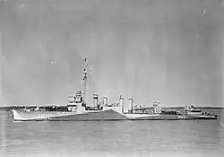 Renamed HMS Burnham - in part in honour of Burnham, Pennsylvania and Burnham-on-Sea, Somerset - the destroyer began escort duties with the British Navy in December 1940. In early 1941, Burnham began a series of escort voyages between Iceland and Newfoundland. Burnham was modified for trade convoy escort service by removal of three of the original 4-inch (102 mm)/50 caliber guns and three of the triple torpedo tube mounts to reduce topside weight for additional depth charge stowage and installation of a Hedgehog anti-submarine mortar.[2] Throughout 1942 and 1943, Burnham worked mainly between Newfoundland and Londonderry Port, Derry, Northern Ireland. Burnham was assigned to Escort Group C-2 of the Mid-Ocean Escort Force for convoys ON 113, HX 201, ON 119, SC 97, ON 129 and SC 102 and then to Escort Group C-3 for convoys ON 152, HX 221, ON 163, HX 226, ON 172, SC 124, ON 180 and HX 238 during the winter of 1942-43.[3]
