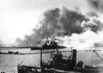 ![]() USS Avocet in foreground during the Attack on Pearl Harbor. USS Nevada is in the background, with a large American flag on her stern.