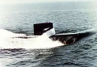 ![]() USS Baltimore (SSN-704) underway in moderate seas. Notice the trough beneath the sail.