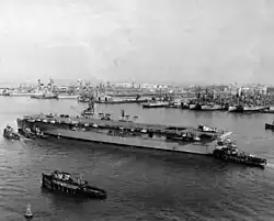 The keel for Belleau Wood was laid down on 11 August 1941 at the New York Shipbuilding Corporation. She was originally ordered as a Cleveland-class cruiser under the name New Haven, which was to be designated with the hull number CL-76.[1] Starting in January 1942, President Franklin Delano Roosevelt ordered the first of several of the new cruisers to be converted into light carriers, and New Haven was among those selected for conversion on 10 February.[3] On 31 March, the ship was renamed Belleau Wood, after the Battle of Belleau Wood, a major battle fought by the Marine Corps during World War I. She also received an updated hull number: CV-24.[4] The third member of what was now the Independence class of light carriers, the ship was launched on 6 December 1942, and after completing fitting out work, the ship, now renamed Belleau Wood, was commissioned on 31 March 1943.[1]