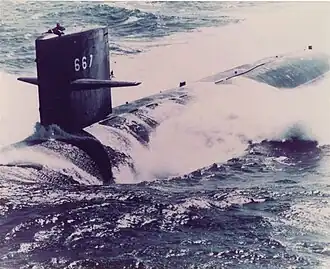 ![]() USS Bergall (SSN-667), possibly while on sea trials off New England in 1968-1969.