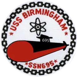 USS Birmingham (SSN-695), a Los Angeles-class submarine, was the third ship of the United States Navy to be named for Birmingham, Alabama. The contract to build her was awarded to Newport News Shipbuilding and Dry Dock Company in Newport News, Virginia on 24 January 1972 and her keel was laid down on 26 April 1975. She was launched on 29 October 1977 sponsored by Mrs. Maryon Pittman Allen, wife of Senator James Allen, and commissioned on 16 December 1978.