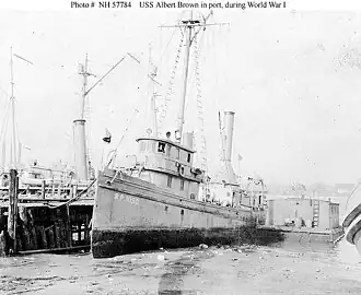 The 103-foot patrol and minesweeping tug, was built at Bristol, Maine, in 1875 as a steam fishing trawler. She was rebuilt in 1897 and remained active in the Menhaden fishery, operating out of Lewes, Delaware, until taken over by the Navy for World War I service. She served in the Delaware Bay area. In 1919 or early 1920, she was reported to be sunk at the Naval Air Station, Cape May, New Jersey, and was stricken from the Navy list in March 1920. After efforts to sell the wreck were unsuccessful, Albert Brown's remains were removed by Army Engineers. She was officially abandoned by the Navy in early 1923.