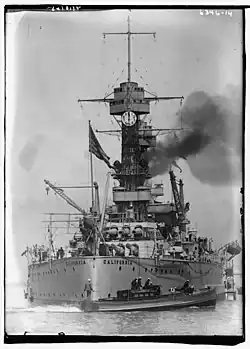 California's keel was laid down on 25 October 1916 at the Mare Island Naval Shipyard in Vallejo, California.[2] Work was halted for a short time during World War I while the shipyard focused on outfitting smaller craft.[4] She was launched 20 November 1919 and commissioned on 10 August 1921.[2] On entering service, she joined the Battle Fleet, serving as its flagship. For the duration of her peacetime career, California was occupied with routine training exercises, including joint Army-Navy maneuvers and the annual fleet problems. On the night of 11 November 1924, Lieutenant Dixie Kiefer took off from the ship, the first night aircraft launch in history. Further experimentation with aircraft continued in early 1925, when the ships of the Battle Fleet received a squadron of Curtiss TS-1 floatplanes on 31 March. In mid-1925, the Battle Fleet crossed the Pacific Ocean on a goodwill cruise to Australia and New Zealand; on the way, the ships stopped in Pago Pago, American Samoa. California underwent a refit at the Puget Sound Navy Yard at Bremerton, Washington later that year.[5]