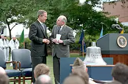One of the ship's propellers was placed on display at the Los Angeles Maritime Museum.[12] The ship's bell was kept in storage, and despite US law preventing the possession of naval artefacts by other nations, a campaign led to the bell being presented to Australian Prime Minister John Howard by US President George W. Bush on 10 September 2001, as commemoration for the 50 years of the ANZUS treaty.[13] The 250-pound (110 kg) bell was placed on display in the USA Gallery of the Australian National Maritime Museum.[13]