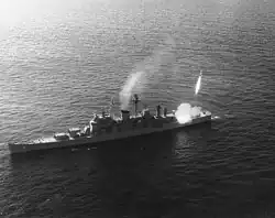 She left Boston in January 1944,[5] San Diego, and joined Task Force 58 in mid-February.[5] In late February, the ship provided bombardment support during the Battle of Eniwetok.[5][6] During March and April, the cruiser formed part of the USS Yorktown carrier task group, supporting the aircraft carrier during air raids on Palaus, Yap, Ulithi and Woleai during 31 March and 1 April.[5] On 13 April, Canberra escorted Yorktown's aircraft when they provided support to amphibious landings at Hollandia and Wakde.[5]
