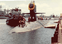 ![]() USS Cavalla (SSN-684) entering the harbor at Naval Station Pearl Harbor, Hawaii, on 1 January 1997 with Ford Island and the Arizona Memorial in the background.