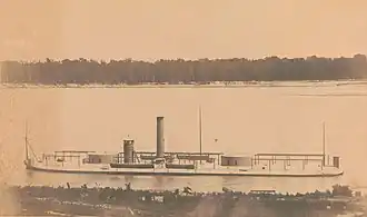 After commissioning, Chickasaw patrolled the Mississippi River against Confederate raids and ambushes for several months. She was transferred to Rear Admiral David Farragut's West Gulf Blockading Squadron on 9 July,[7] together with her sister Winnebago. The ship required some time to refit at New Orleans and prepare for the voyage to Mobile across the Gulf of Mexico, so the two sisters did not depart New Orleans until 29 July. On the voyage down the Mississippi to the Pass A Loutre, Chickasaw was forced to anchor overnight because of steering problems and the two ships did not cross the sandbar at the mouth of the pass until the evening of the following day. Once in the Gulf, Chickasaw was taken under tow by the sidewheel gunboat Tennessee for the voyage across the Gulf. The two ships were forced to stop at Ship Island so Chickasaw's engines could be repaired. That required only a day and the sidewheel gunboat Metacomet towed the monitor the rest of the way.[8]