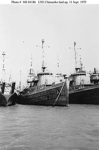 - 18 February 1946; Chimariko departed Hong Kong and, after brief periods of salvage and towing duty at Subic Bay, P.I. and Guam, she steamed via Pearl Harbor to San Pedro, Calif., arriving 9 June to be placed out of commission and placed in the Pacific Reserve Fleet 31 October 1946.
