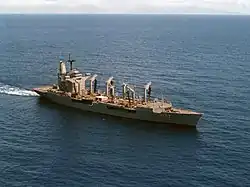 USS Cimarron (AO-177) was the lead ship of the Cimarron-class of fleet oilers of the United States Navy. Cimarron was built at the Avondale Shipyards in New Orleans, Louisiana (USA) starting in 1978 and was commissioned in 1981 for service in the Pacific Fleet. Commissioned at the Naval Supply Center, 10 January 1981, in Oakland, California. The oiler was home ported in Pearl Harbor, Hawaii. The total cost for the ship was $136.7 million.[1]