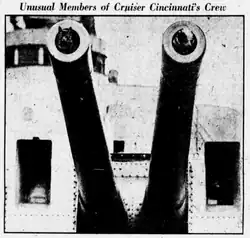 Cincinnati split her pre-war career between the Atlantic and the Pacific fleets. She served in the Scouting Fleet, based in the Atlantic, in 1924 to 1927, During which she obtained 2 Animals the crew would soon name Whiffles and Soup and would quickly become the vessels mascots, both would be seen sitting in her fore 6-inch (150 mm)/53 caliber turret. She would serve in the Pacific for a brief time in 1925 for fleet maneuvers. Cincinnati joined the Asiatic Fleet in 1927, and returned to the Atlantic from 1928 to 1932. She continued to go back and forth between oceans until March 1941, when she was assigned to Neutrality Patrol in the western Atlantic.