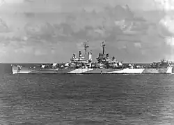 The keel for Columbia was laid down on 19 August 1940 at the New York Shipbuilding Corporation. She was launched on 17 December 1941, ten days after the Japanese attack on Pearl Harbor brought the United States into World War II. Columbia was moved to the Philadelphia Navy Yard before she was commissioned into the fleet on 29 June 1942.[2][3] After completing fitting-out work, the ship got underway for initial training on 14 September, which was carried out off Hampton Roads, Virginia, and included weapons familiarization practice and aircraft operations. Columbia then sailed for the Norfolk Navy Yard for repairs and alterations and then embarked on her shakedown cruise in Chesapeake Bay, which lasted from 16 October to 8 November The next day, she got underway and joined Task Group (TG) 2.6, which also included the fast battleship Indiana and the destroyers De Haven, Champlin, and Saufley. The ships sailed south and arrived in Panama on 13 November.[3]