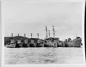![]() Competent (third ship from right) among six other minesweepers and mothership LST-735.