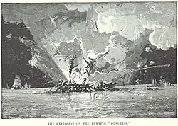 Congress was anchored off Newport News, Virginia, as part of the Union blockade of that port on March 8, 1862, when she fell under attack by the Confederate ironclad, CSS Virginia (ex-USS Merrimack) and five other small ships.[3] Serving aboard Congress at this time was McKean Buchanan, brother of the commanding officer of the Virginia, Franklin Buchanan.[4] After exchanging broadsides with Virginia, Congress slipped her moorings and ran aground in shallow water.