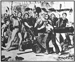 On both ships, boarding parties were summoned and musket fire broke out. Aboard Constitution, Lieutenant William S. Bush was killed and Lieutenant Charles Morris wounded by musket shots, as was Captain Dacres. Only Guerriere's narrow bowsprit provided a way between the ships, and in the heavy sea, neither side could venture across it. Some of the gunners aboard Guerriere fired at point-blank range into Hull's stern cabin, setting the American ship on fire briefly. The two locked ships slowly rotated clockwise until they broke free. Guerriere's foremast and mainmast both then fell "by the board" i.e. snapped off at deck level, leaving her helpless and rolling heavily.[12] Dacres attempted to set sail on the bowsprit to bring his ship before the wind, but it too had been damaged and broke.[13] The Constitution meanwhile ran downwind for several minutes, repairing damage to the rigging, before once again wearing and beating upwind to return to battle.