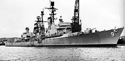 Commissioned in 1960, she spent the early part of her career in the Pacific Ocean, participating in four tours of duty during the Vietnam War. In the early 1970s she transferred to the east coast and spent the remainder of her service years in the Caribbean Sea, Atlantic Ocean, Mediterranean Sea, and Persian Gulf. She assisted in saving USS Stark after that ship was hit by Iraqi missiles. In 1975, as part of the Navy's reclassification process, all ships of her class were reclassified as guided missile destroyers (DDG).