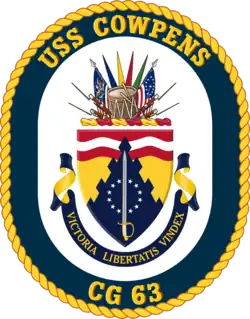 USS Cowpens (CG-63) was a Ticonderoga-class guided missile cruiser in service with the United States Navy from 1991 to 2024. The ship is named after the Battle of Cowpens, a major American victory near Cowpens, South Carolina, in the American Revolution. She was built at the Bath Iron Works in Maine. Cowpens was last stationed at Naval Base San Diego.