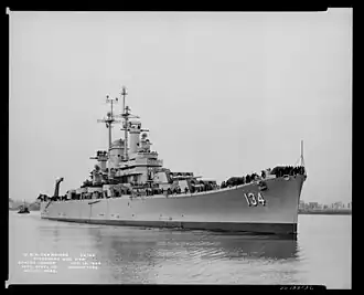 USS Des Moines (CA-134) was the lead ship of the class of United States Navy (USN) heavy cruisers. She was the first USN ship to mount the auto-loading 8-inch (203 mm) Mark 16 guns, the first large-caliber auto-loading guns in the world. She was the second ship of the USN to be commissioned with the name of the city of Des Moines, capital of Iowa. Launched 1946, she was commissioned in 1948. She saw duty around the world until her decommissioning in 1961 when she was permanently mothballed. A 1981 survey was done to determine if she was worthy of reactivation for the 600-ship Navy, but the cost was too great so she remained in the reserve. She was struck from the Naval Vessel Register in 1993, which was followed by a campaign to turn her into a museum ship. The campaign failed, and in 2005 she was sold for scrapping, and she was broken up by July 7. Parts of the ship have been donated to various places for display, including at the USS Salem museum, which is the only Des Moines-class ship to avoid the scrapyard.