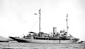 Registered dimensions and specifications were tonnage of 367 NRT and 539 GRT, 195 ft 6 in (59.6 m) registered length, 213 ft (64.9 m) length overall, and 183 ft (55.8 m) at the waterline with an extreme breadth of 27 ft 2 in (8.3 m). Ship's depth was 15 ft 9 in (4.8 m) with a draft of 13 ft 9 in (4.2 m).[3] Ships' Data U.S. Naval Vessels, recorded upon entry to naval service, shows slightly different measurements, methods vary and the vessel had undergone ownership changes, with length of 217 ft (66.1 m), beam of 28 ft 6 in (8.7 m) and a mean draft of 13 ft 6 in (4.1 m).[4] That Navy information shows a top speed of 17 knots (31 km/h; 20 mph), cruising speed of 10 knots (19 km/h; 12 mph) and an endurance of 4,800 nautical miles (8,900 km; 5,500 mi).[4] Four Almy boilers provided steam for two vertical triple expansion engines with an 2,400 indicated horsepower (1,800 kW) on trial driving two screws. Electrical power was provided by two General Electric generating sets rated at 18 and 4 kilowatts (24.1 and 5.4 hp) at 120 volts. A 1-kilowatt wireless set was also installed.[4]