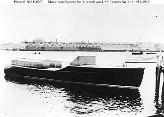 This article incorporates text from the public domain Dictionary of American Naval Fighting Ships. The entry can be found here.- Department of the Navy Naval History and Heritage Command Online Library of Selected Images:Civilian Ships: Express # 4 (American Motor Boat, 1917). Served as USS Express # 4 (SP-745) in 1917-1919