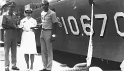 USS Francis Hammond (DE-1067) was laid down on 15 July 1967 at San Pedro, Calif., by Todd Shipyards, Los Angeles Division; launched on 11 May 1968; sponsored by Mrs. Phyllis Hammond Smith, widow of HM3 Francis C. Hammond; and commissioned on 25 July 1970, Cmdr. John E. Elmore in command.[4]