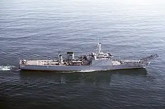 The Newport class were larger and faster than previous LSTs and were able to transport tanks, heavy vehicles and engineer groups and supplies that were too large for helicopters or smaller landing craft to carry.[6] The LSTs have a ramp forward of the superstructure that connects the lower tank deck with the main deck and a passage large enough to allow access to the parking area amidships. The vessels are also equipped with a stern gate to allow the unloading of amphibious vehicles directly into the water or to unload onto a utility landing craft (LCU) or pier. At either end of the tank deck there is a 30 ft (9.1 m) turntable that permits vehicles to turn around without having to reverse.[1][2] The Newport class has the capacity for 500 long tons (510 t) of vehicles, 19,000 sq ft (1,800 m2) of cargo area and could carry up to 431 troops.[1][7] The vessels also have davits for four vehicle and personnel landing craft (LCVPs) and could carry four pontoon causeway sections along the sides of the hull.[2][3]