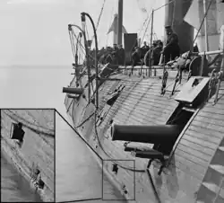 On the morning of 15 May, Galena led her squadron up to Drewry's Bluff, about 8 miles (13 km) from Richmond, where the Confederates had blocked the river and placed a battery on the 90-foot (27 m) bluff to cover the obstacles. Galena anchored some 600 yards (550 m) from the bluff and opened fire at 07:45, while the wooden ships remained further downriver. Monitor attempted to fire on the battery as well, but her guns could not elevate enough to reach it.[15] Galena engaged the Confederate position for over three hours, until her ammunition was nearly exhausted.[16] Her fire was largely ineffective, although her shells did manage to kill seven and wound eight members of the battery. In return, the ship was hit an estimated 44 times on her port side, of which 13 hits penetrated her armor and she had three large holes punched through her spar deck. She suffered 13 crewmen killed and a further 11 wounded.[16][17] In a letter to his wife, Rodgers said that "her sides look as though she had an attack of smallpox".[17] Two sailors and one marine aboard Galena were awarded the Medal of Honor for their actions during the battle: Fireman Charles Kenyon, Quartermaster Jeremiah Regan, and Corporal John F. Mackie. Mackie was the first member of the U.S. Marine Corps to receive the medal.[18][19]
