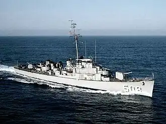 USS Gilligan (DE-508) was a John C. Butler-class destroyer escort acquired by the U.S. Navy during World War II. The primary purpose of the destroyer escort was to escort and protect ships in convoy, in addition to other tasks as assigned, such as patrol or radar picket. After the war, she returned home with one battle star to her credit.